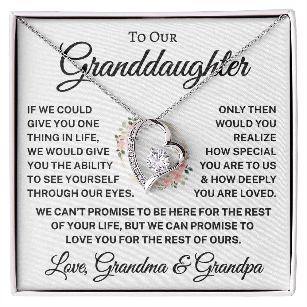 Celebrate the unbreakable bond between grandparents and their Granddaughter with this heartfelt Forever Love Necklace. Designed to capture a lifetime of love, pride, and cherished memories, this meaningful gift will remind her every day just how special she is. Whether it’s for a birthday, graduation, Christmas, milestone celebration, or just because, this elegant keepsake is the perfect way to show your love and affection.